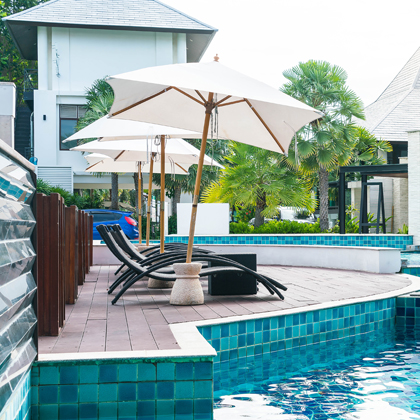 Scenic background with greenery, water bodies, or resort décor.